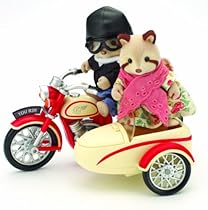 This old-fashioned motorcycle and sidecar has storage spaces in the front of the sidecar and the pannier at the back of the cycle. George & Mildred Mulberry are Racoon Grandparents who enjoy riding around the country lanes, he has helmet & goggles so he can see where he is going.Mildred likes to wrap up warm before they set off as it can get a bit breezy in the side car!